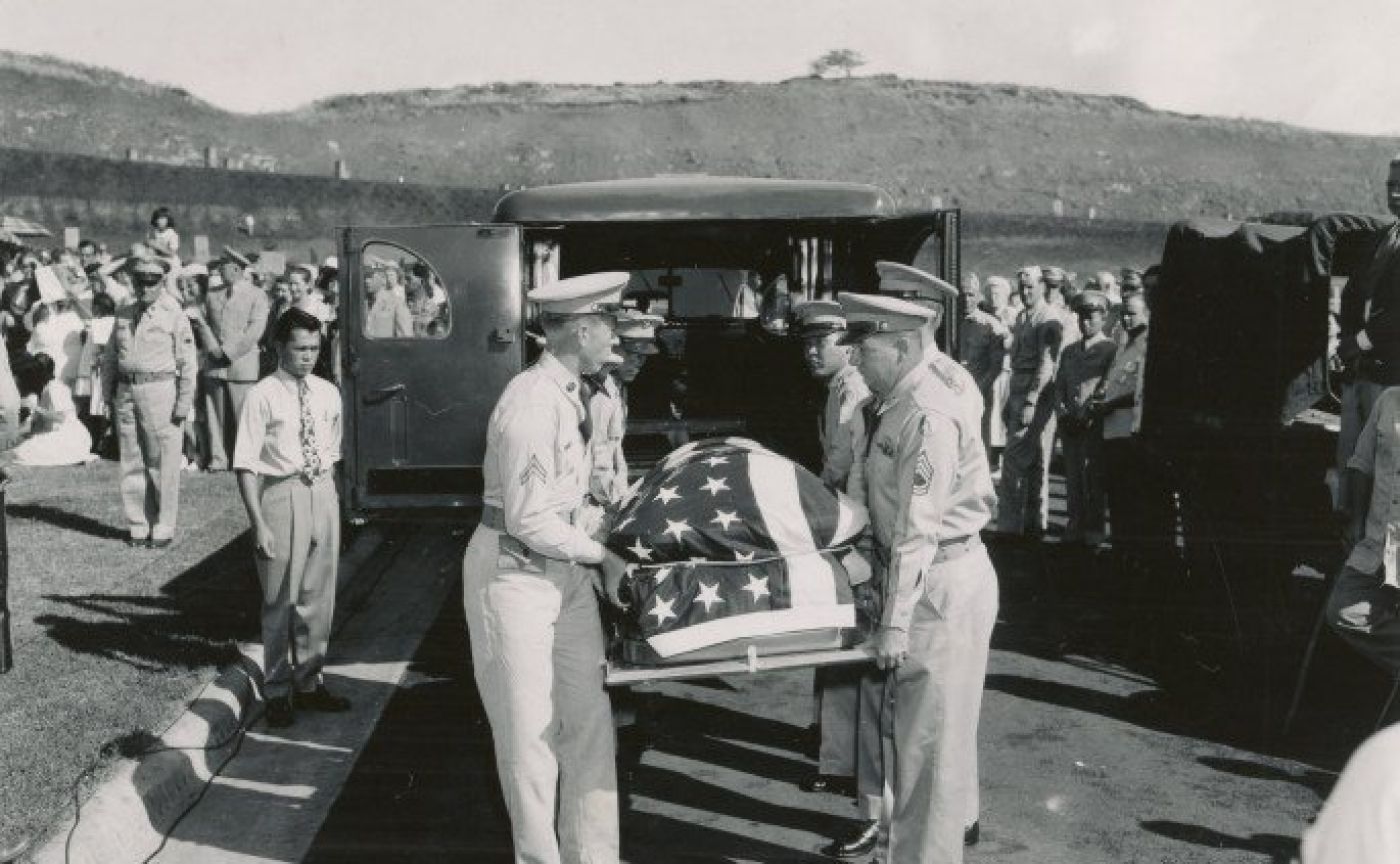 The body of Ernie Pyle was laid to final rest in the new Punchbowl Memorial Cemetery of the Pacific, Oahu, July 19, 1949. Photo courtesy of National Archives
